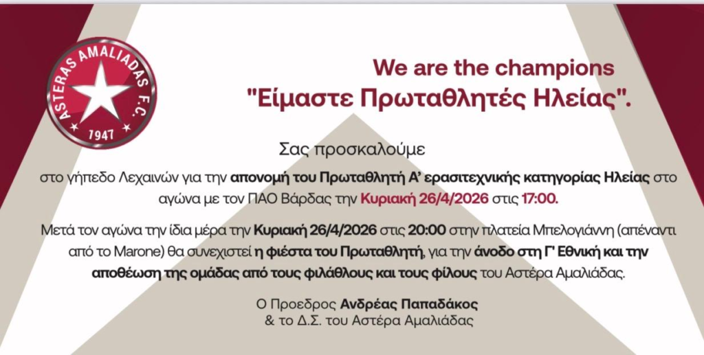 ΑρχικήΑθλητικάΑΣΤΕΡΑΣ ΑΜΑΛΙΑΔΑΣ ΕΙΜΑΣΤΕ ΠΡΩΤΑΘΛΗΤΕΣ ΗΛΕΙΑΣΑθλητικάΗλεία-Δυτική ΕλλάδαΑΣΤΕΡΑΣ ΑΜΑΛΙΑΔΑΣ ΕΙΜΑΣΤΕ ΠΡΩΤΑΘΛΗΤΕΣ ΗΛΕΙΑΣ24 Απριλίου 2026 13:17 img 2026 04 24 13 15 47εικόναΚοινοποίηση σε...FacebookXWhatsAppΤυπώνω Προηγούμενο άρθροΠύργος:Μια ξεχωριστή ευρωπαϊκή θεατρική συνάντηση στο 1ο Γυμνάσιο ΠύργουΕπόμενο άρθροΤο Μαξίμου, ο Σκέρτσος και η μοναξιά των βουλευτών ΔΕΙΤΕ ΕΠΙΣΗΣ ΕκπαίδευσηΠύργος:Μια ξεχωριστή ευρωπαϊκή θεατρική συνάντηση στο 1ο Γυμνάσιο Πύργου 24 Απριλίου 2026 13:11 Ηλεία-Δυτική ΕλλάδαΗλεία:Ανακοίνωση διακοπών ρεύματος 24 Απριλίου 2026 13:07 ΕλλάδαΠρωταθλητής μαχητικού σπορ μετέφερε στην Εθνική Οδό 1,15 εκατ. ευρώ μετρητά σε σακούλες σούπερ μάρκετ 24 Απριλίου 2026 09:19 ΔΙΑΒΑΣΤΕ ΕΠΙΣΗΣΤο Μαξίμου, ο Σκέρτσος και η μοναξιά των βουλευτών 24 Απριλίου 2026 13:26 Πύργος:Μια ξεχωριστή ευρωπαϊκή θεατρική συνάντηση στο 1ο Γυμνάσιο Πύργου 24 Απριλίου 2026 13:11 Ηλεία:Ανακοίνωση διακοπών ρεύματος 24 Απριλίου 2026 13:07 Τραγωδία στη Λάρισα: Μητέρα και κόρη εντοπίστηκαν νεκρές μέσα στο σπίτι τους 24 Απριλίου 2026 12:36 Φόρτωση περισσοτέρων