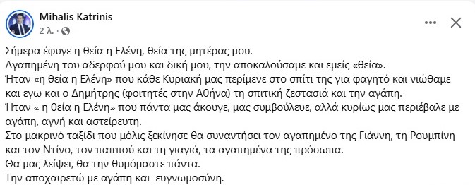 Ένα ιδιαίτερα αγαπημένο πρόσωπο του Βουλευτή Ηλείας Μιχάλη Κατρίνη έφυγε τη Κυριακή από τη ζωή… Ο λόγος για τη θεία της μητέρας του- την οποία αγαπούσαν τόσο εκείνος όσο και ο αδερφός του σα δική τους Θεία. Ο Μ. Κατρίνης σε ανάρτηση του επεσήμανε: «Σήμερα έφυγε η θεία η Ελένη, θεία της μητέρας μου.