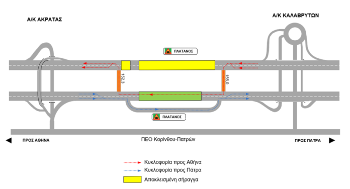 Για την εκτέλεση των ανωτέρω εργασιών, απαιτείται ο αποκλεισμός του κλάδου προς Αθήνα και εκτροπή της κυκλοφορίας στον κλάδο κυκλοφορίας προς Πάτρα μέσω των Ανοιγμάτων Έκτακτης Ανάγκης (Α.Ε.Α.) από τη Χ.Θ. 155,00 έως τη Χ.Θ. 152,30, ενώ η κυκλοφορία προς Πάτρα θα εξυπηρετείται από την παράπλευρη βοηθητική οδό των σηράγγων που βρίσκεται βορείως αυτών, σύμφωνα με το ακόλουθο διάγραμμα: