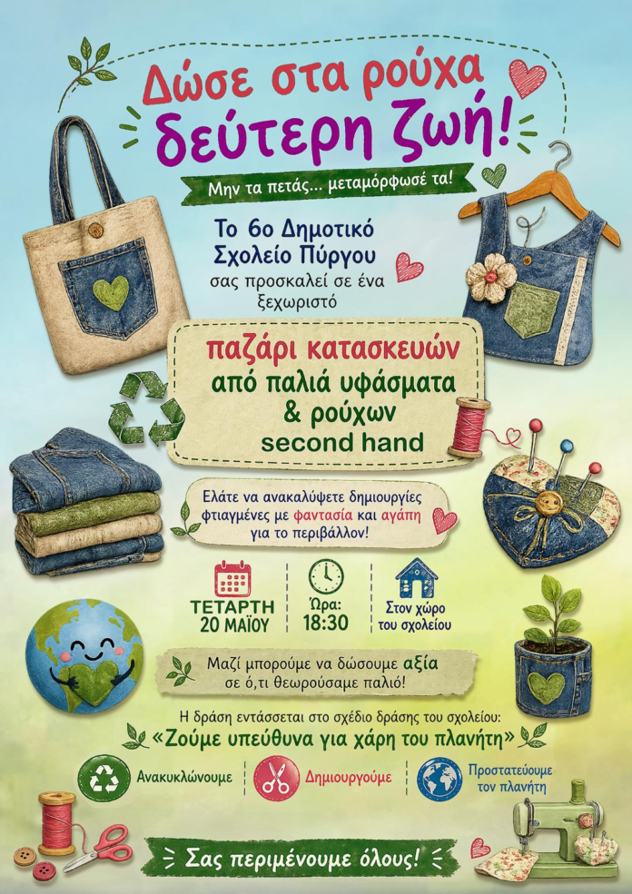 Το 6ο Δημοτικό Σχολείο Πύργου, στο πλαίσιο του σχεδίου δράσης «Ζούμε υπεύθυνα για χάρη του πλανήτη», διοργανώνει την Τετάρτη 20 Μαΐου στις 6.30 μ.μ. παζάρι με κατασκευές από παλιά υφάσματα και ρούχα second hand.Κατά τη διάρκεια της χρονιάς, οι μαθητές συμμετείχαν σε δράσεις όπως έρευνα για το ανθρακικό και πλαστικό αποτύπωμα, δενδροφύτευση και εργαστήρια επαναχρησιμοποίησης με τη συμμετοχή γονέων.Το παζάρι αποτελεί την κορύφωση της προσπάθειας αυτής, προωθώντας την επαναχρησιμοποίηση και τη μείωση της κατανάλωσης ενέργειας.Σας περιμένουμε να στηρίξετε την πρωτοβουλία μας και να γίνετε μέρος μιας πιο βιώσιμης καθημερινότητας!